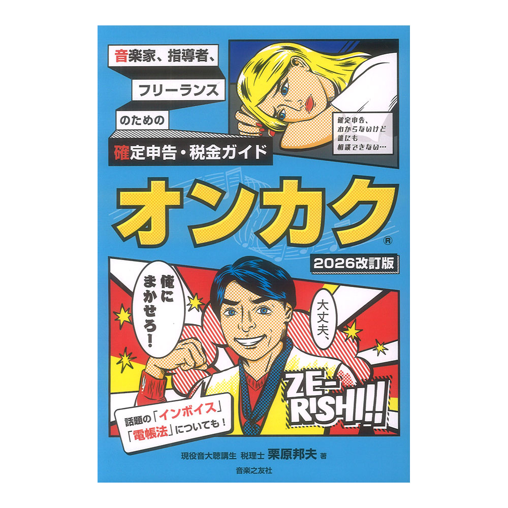 音楽之友社 音楽家 指導者 フリーランスのための確定申告 税金ガイド オンカク 2026改訂版【楽譜】 「税金のこと、よくわからな〜い(泣)」という演奏家、指導者、作曲家、編曲家、ライター…音楽業界に携わるすべてのフリーランスとその卵に捧ぐ、確定申告・税金ガイドの決定版。 2025年に実施の「所得税の基礎控除の見直し」などにも対応し、今年度の用紙への記入方法もフォロー。2023年に開始した「インボイス制度」の経過措置についても取り上げる。豊富な記入例で、初めて確定申告書を作成する方でも理解しながら書ける! 現役の音楽大学聴講生で、元オスカープロモーション所属という異色の税理士が、音大を卒業したばかりの主人公の相談にのるストーリーで、税金と確定申告について、わかりやすく解説。\“音楽家によくある経費\”の具体例を豊富にあげながら、帳簿のつけ方から確定申告書の書き方まで指南する。音楽教室を営む人のための「特別レッスン」や、ビジネス感覚が身につく「おせっかいビジネス講座」などのコーナーも充実。