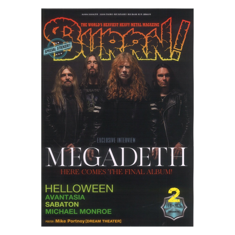 シンコーミュージック BURRN! 2026年2月号【雑誌】 ●BURRN!特製アーティスト・ロゴ・ステッカー付! ●巻頭大特集:MEGADETH…最終作「MEGADETH」の全貌を遂に明かすデイヴ・ムステイン直撃インタビュー! ●海外ライヴ・リポート:HELLOWEEN/SABATON ●独占会見:ヤングブラッド/トーマス・ラッジ他 ●ライター陣が選ぶ2025年度マイ・ベスト/2026年の展望 ●来日:マイケル・モンロー/OPETH/HALO EFFECT/AVANTASIA/エドゥ・ファラスキ&ロイ・カーン他 ●ポスター:マイク・ポートノイ[DREAM THEATER] 発売日 2026/01/07 サイズ A4判 ページ数 144ページ