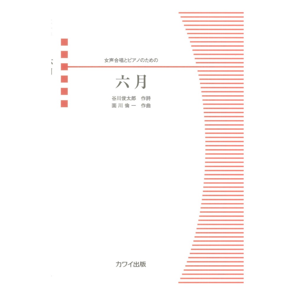 カワイ出版 面川倫一 六月 女声合唱とピアノのための【楽譜】 2026年3月22日、全日本合唱連盟・朝日新聞社主催で行われるコンサート「谷川俊太郎、うたの地平へ」の第3部で演奏される「どこからか言葉が -6つの新曲、さあ、うたの地平へ-」の6作品のうちの一つ。詩人が2016年から亡くなる直前まで続いた朝日新聞連載『どこからか言葉が』から作曲者が選び付曲。それぞれが想う「あなた」に向けて書かれた詩に、クリアな女声合唱の響きと旋律が印象的で、詩人への憧れが映し出されたロマンチックな作品。「合唱団樹の会」の女声合唱団員が初演。 中級 ■曲目: 六月(5’30") 編・著者名:作曲:面川倫一/作詩:谷川俊太郎 判型/頁:A4判/16頁 JAN:4962864940914 ISBN:978-4-7609-4091-2 演奏時間:5’30" シリーズ:合唱ピース 編成:P女3 発売日:2026.03.25