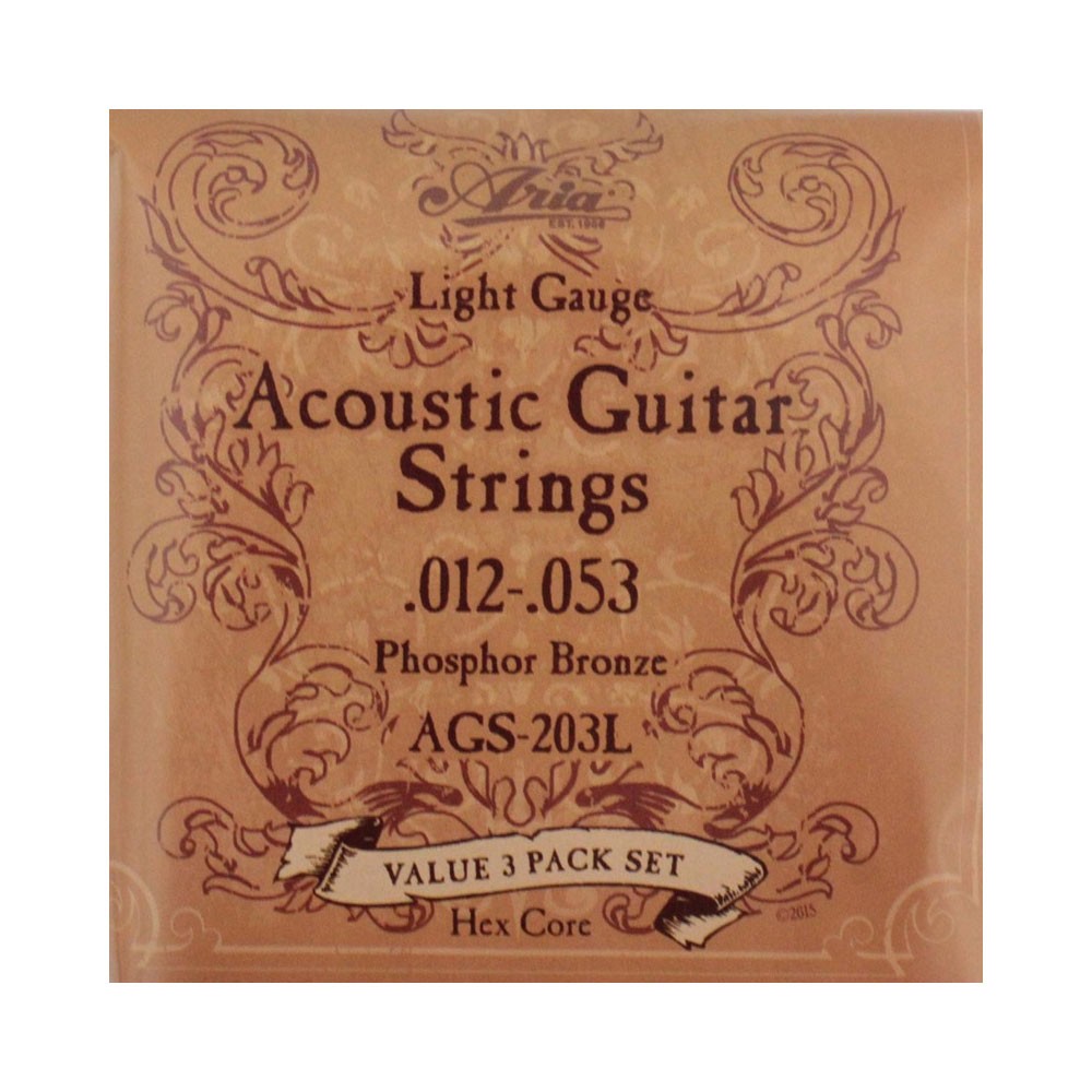 ARIA(アリア) AGS-203L 3セットパック アコースティックギター弦アリアのフォークギター弦 AGS-200Lが3セット入った、予備としても最適なパックです。6角芯を採用。・フォスファーブロンズ・ライトゲージ[012,016,024,032,042,053]