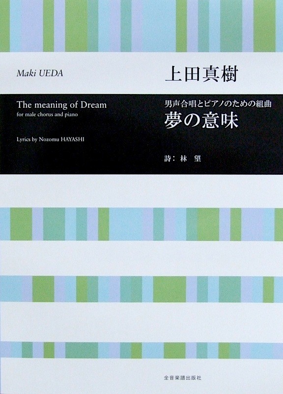 全音楽譜出版社 合唱ライブラリー 上田真樹 男声合唱とピアノのための組曲「夢の意味」【楽譜】 混声合唱「夢の意味」の男声合唱版。テキストは林望の書き下ろしで、5篇の詩から構成されています。 第一篇中の「ゆめのような/うつつのような」のくだりは全5篇の詩に一貫しているテーマであり、音楽面でも、この旋律は3曲目と終曲に歌われます。 色々な夢を見るように、各曲の曲想も様々ですが、柔らかい旋律が膨らんだり縮んだりと、夢が呼吸しているような自然な旋律は歌い手も聴き手も夢をみているような心地よさを感じます。演奏所用時間:約19分30秒。