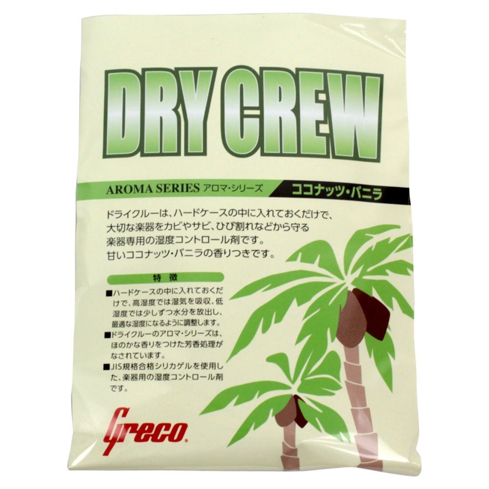 GRECO グレコ DRY CREW ココナッツバニラ 湿度調整剤 ギター小物。ギターケース 乾燥剤。ハードケースに入れておくだけで、大切な楽器をサビやカビ、ひび割れなどから守る湿度調整剤です。高湿度時には湿気を吸収し、低湿度時には少しづつ水分を放出します。JIS規格合格シリカゲルを採用し、常に楽器に最適な湿度に保ちます。使用条件により、6ヶ月から12ヶ月ごとに交換してください。 ほのかに香るココナッツバニラの香りが人気です。内容量 : 70g ×1個