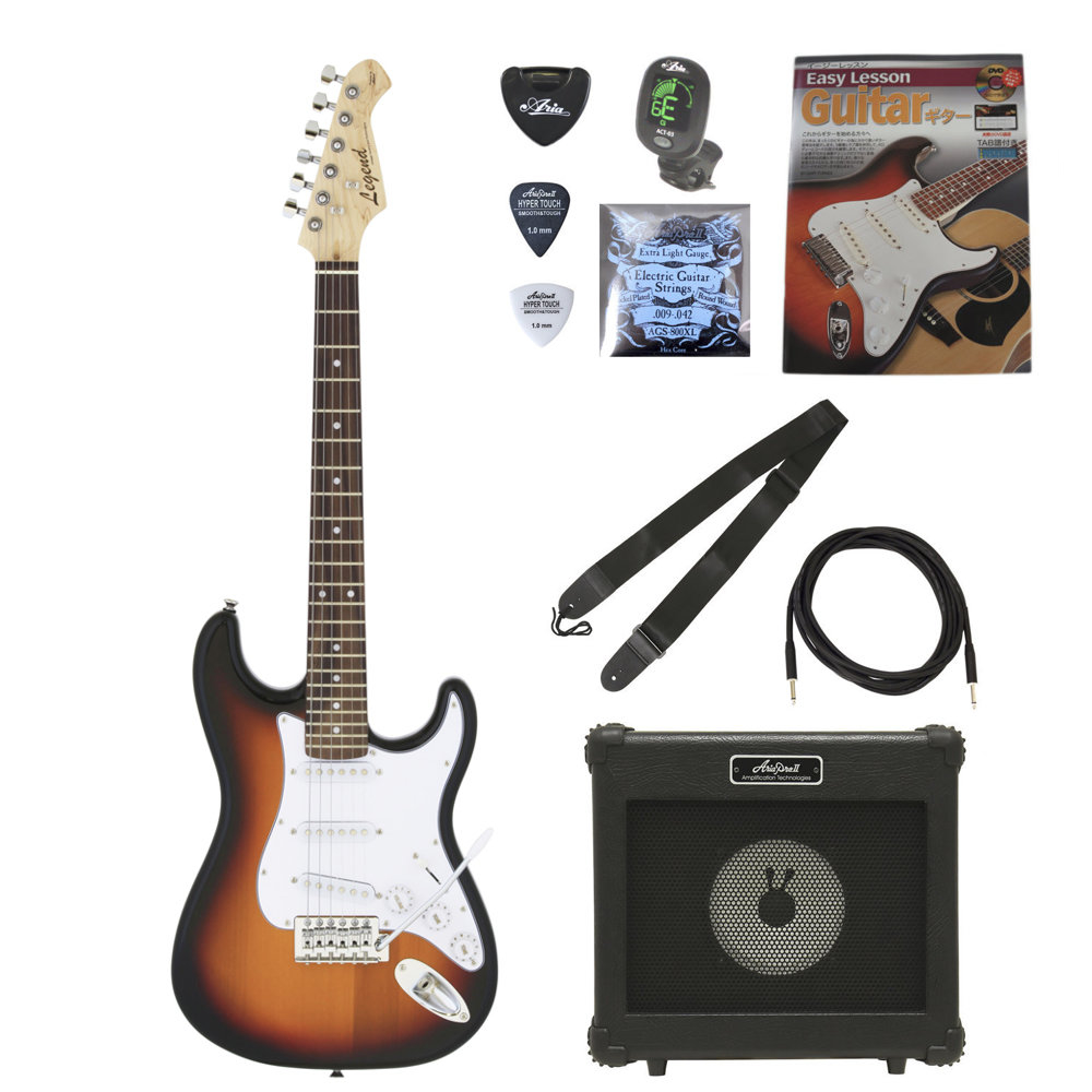 エレキギター 入門セット レジェンド ミニエレキギター LST-MINI 3TS ARIAアンプ付き 9点セット LEGEND ギター 初心者セット。エレキギターにAriaProII AG-10 PLUS、ケーブル、チューナー、ストラップ、換え弦、ピック、ピックケース、DVD付き教則本をお付けしたセットです。LEGEND LST-MINI 3TS ミニエレキギターミニサイズのエレキギター。ボディも小さく、スケールも短いので、お子様向けに、また気軽なトラベルギターとしてもお勧めです。