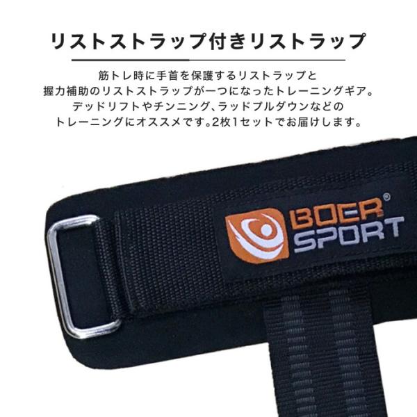 筋トレ時に手首を保護するリストラップと 握力補助のリストストラップが一つになったトレーニングギアです。