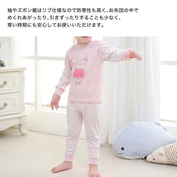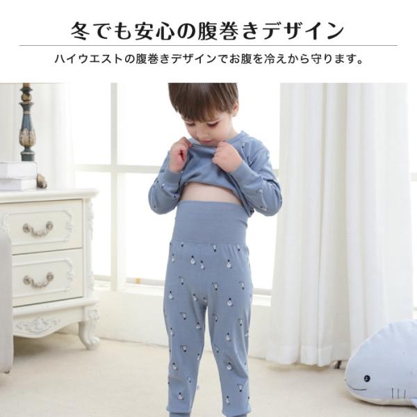 袖やズボン裾はリブ仕様なので防寒性も高く、お布団の中でめくれあがったり、引きずったりすることも少なく、寒い時期にも安心してお使いいただけます。ハイウエストの腹巻きデザインでお腹を冷えから守ります。