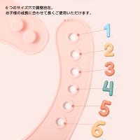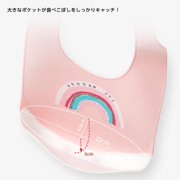 お食事汚れを気にしないかわいいデザインのシリコンビブです。6つのサイズ穴で調整自在。お子様の成長に合わせて長くご使用いただけます。