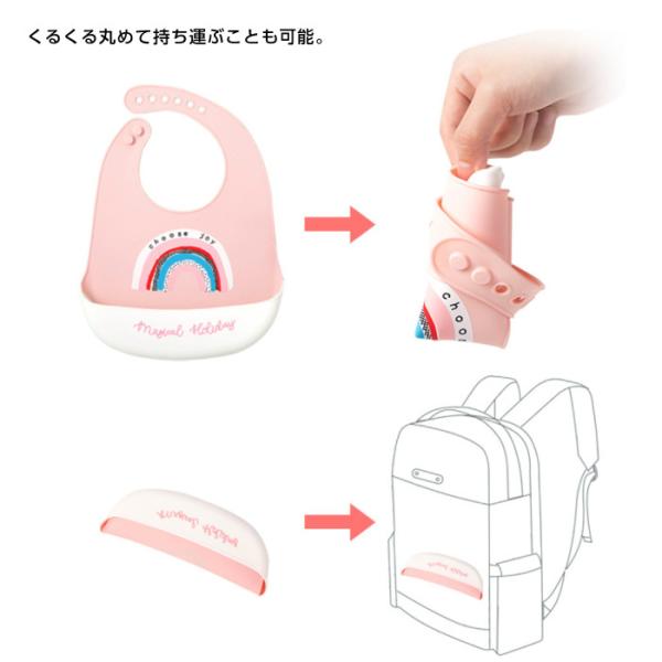 くるくる丸めて持ち運ぶことも可能。大きなポケットが食べこぼしをしっかりキャッチします。