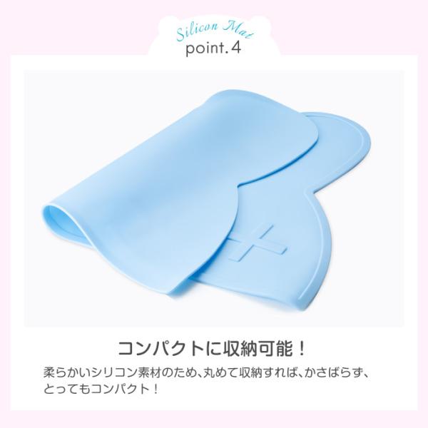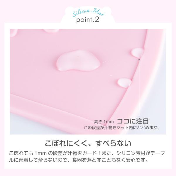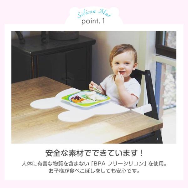 シリコン素材がテーブルにしっかりと張り付いて、マットそのものが滑りにくいのに加えて、マット内にあるわずかな段差がお子様の食べこぼしをマット内にとどめてくれます。