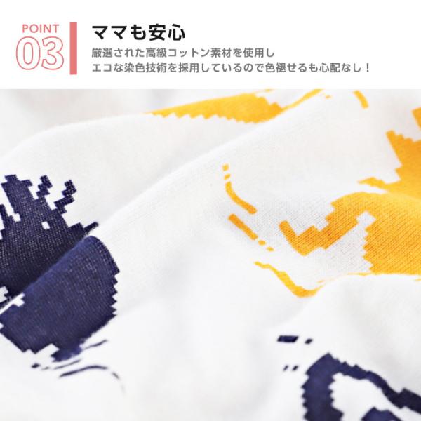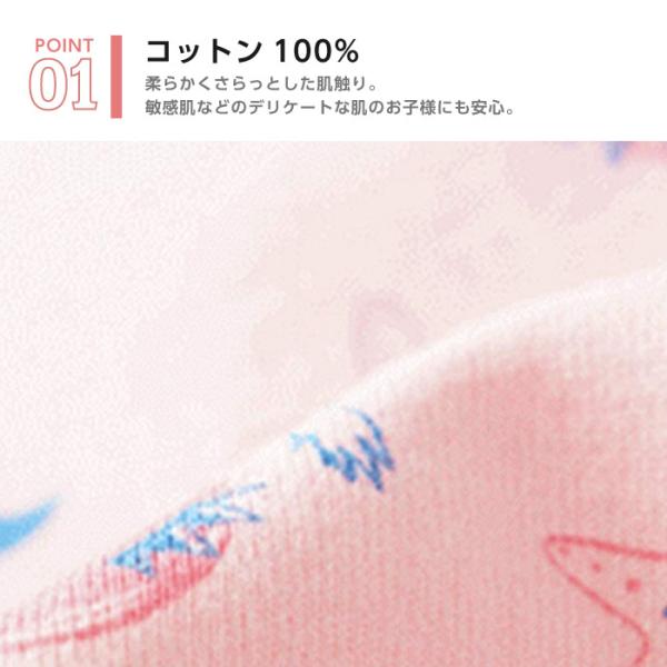 コットン100%の生地を使用しているので、柔らかくさらっとした肌触りで、敏感肌などのデリケートな肌のお子様にも安心して着用していただけます。