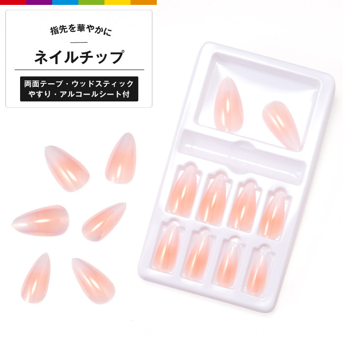 ネイルチップ 可愛い シャイニー ピンク 桜貝色 ロング レギュラーポイント ネイルアート デコネイル 両面テープ