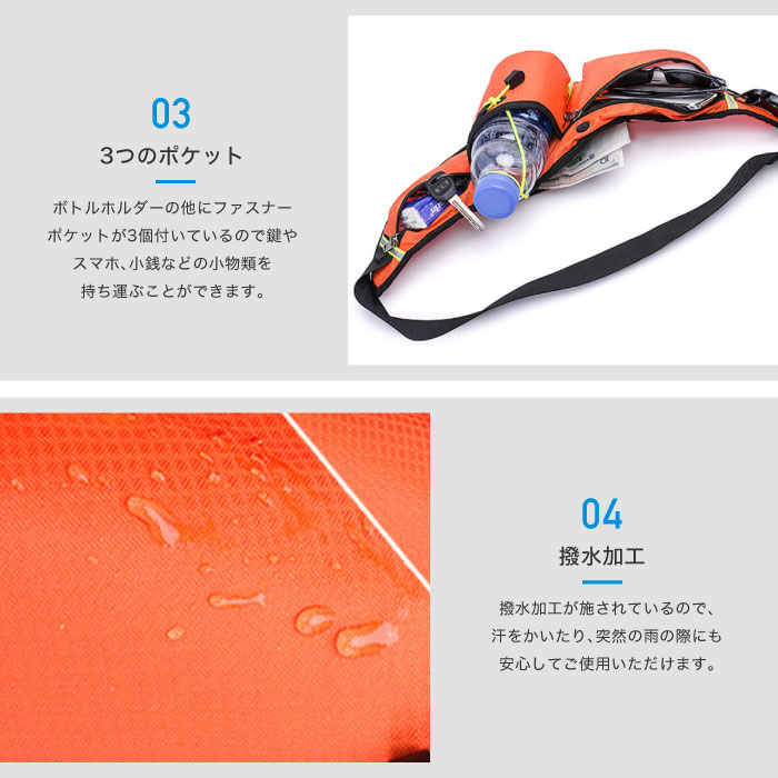 ペットボトルや水筒などを持ち運べるボトルホルダー・ホールドバンド付き。 反射材がついているので暗い時間帯や雨の日でも安心です。 ボトルホルダーの他にファスナーポケットが3個付いているので鍵やスマホ、小銭などの小物類を持ち運ぶことができます。 撥水加工が施されているので、汗をかいたり、突然の雨の際にも安心してご使用いただけます。