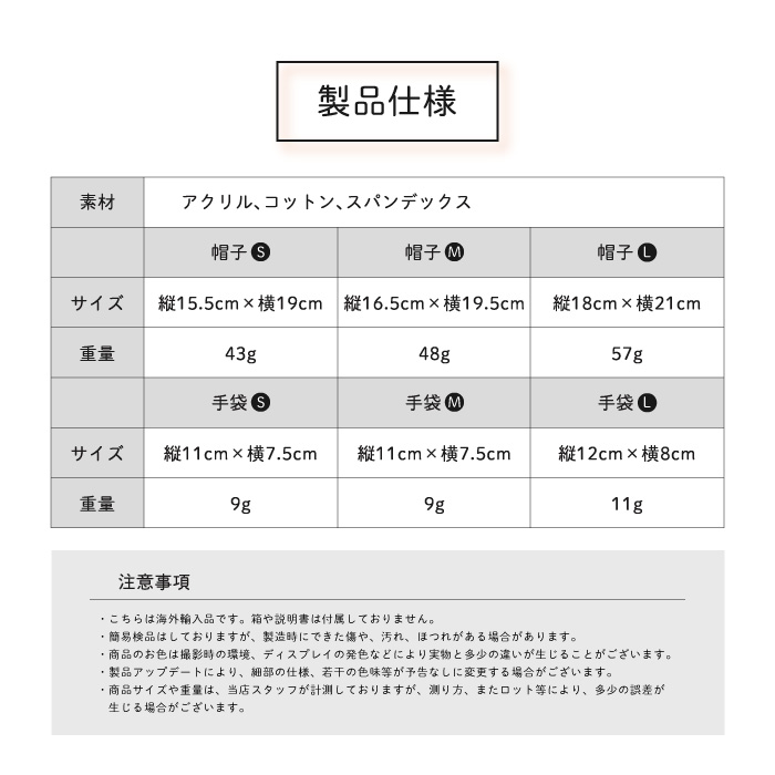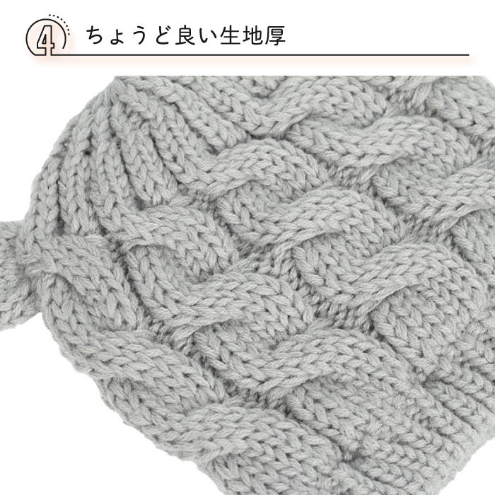 耳付きのデザインが可愛いニット帽と手袋のセットです。 柔らかく、肌に優しい素材を使用しているので、通気性もよく帽子が苦手なお子さまにもオススメです。 伸縮性が高くぴったりフィットするので、優しく大切な頭部を守ります。 手袋もセットになっていて、寒い日のお散歩にもバッチリです。 厚すぎず、薄すぎず、ちょうどよく使いやすい生地の厚さになっております。