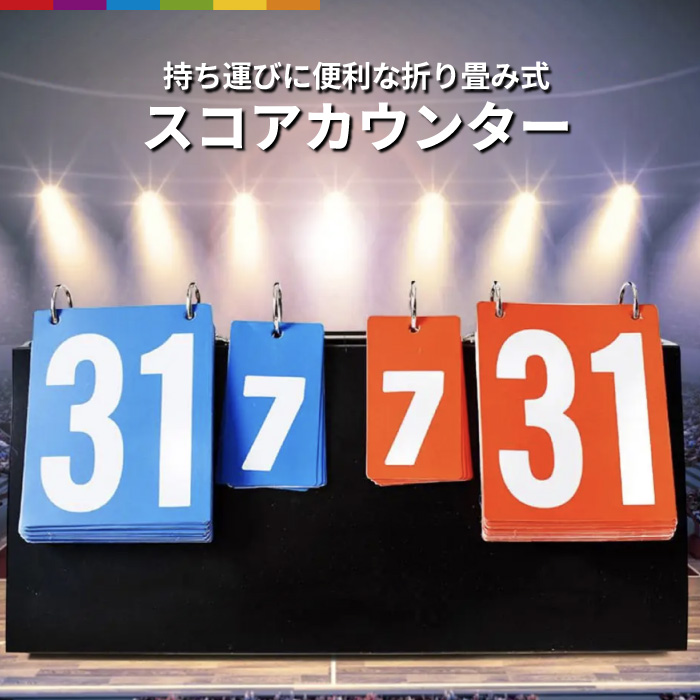 携帯に便利な手動式スコアボードです。 サッカー、バドミントン、ビーチバレー、 バレーボール、ピンポンなど多くのスポーツで大活躍! スナップボタンで留めるだけ! 組立てカンタン!すぐにゲームが始められます。 赤と青の分かりやすい色分け、 白抜きの文字が、遠くからでもクッキリ見やすい!