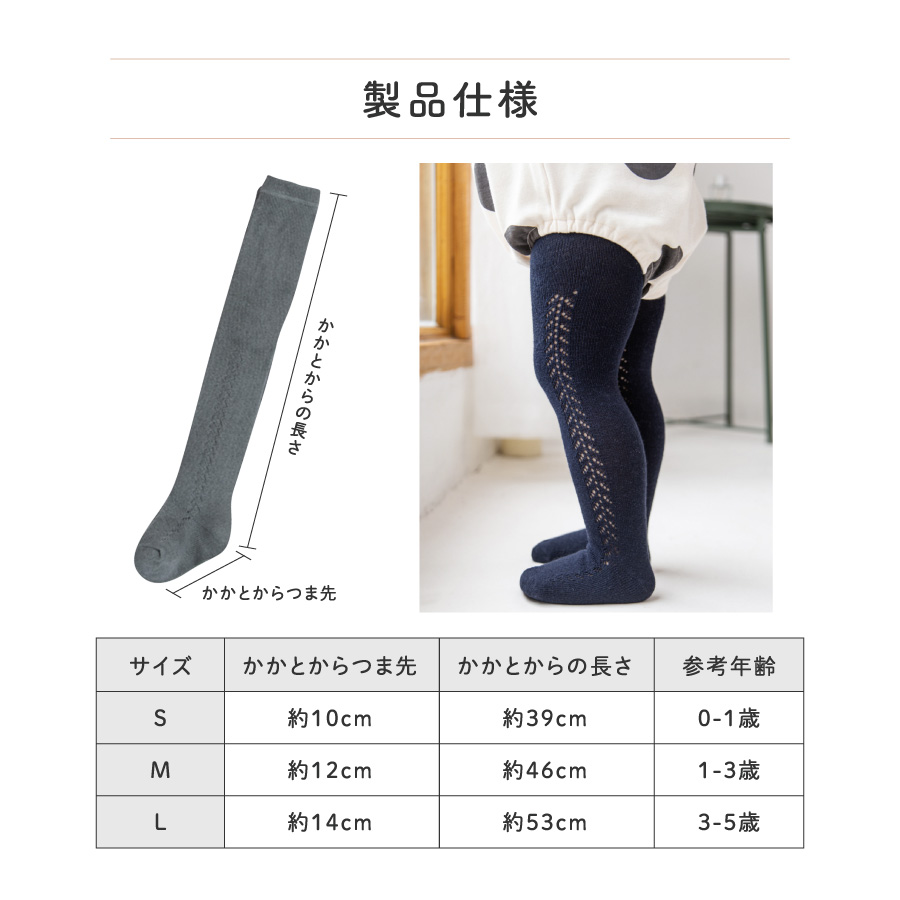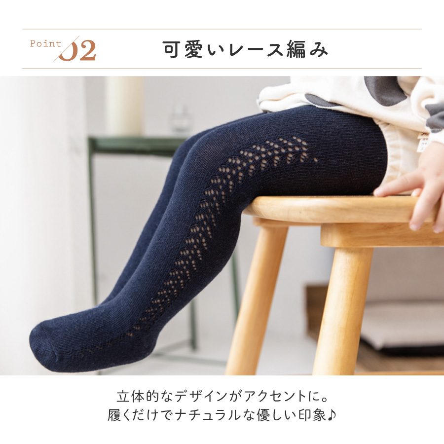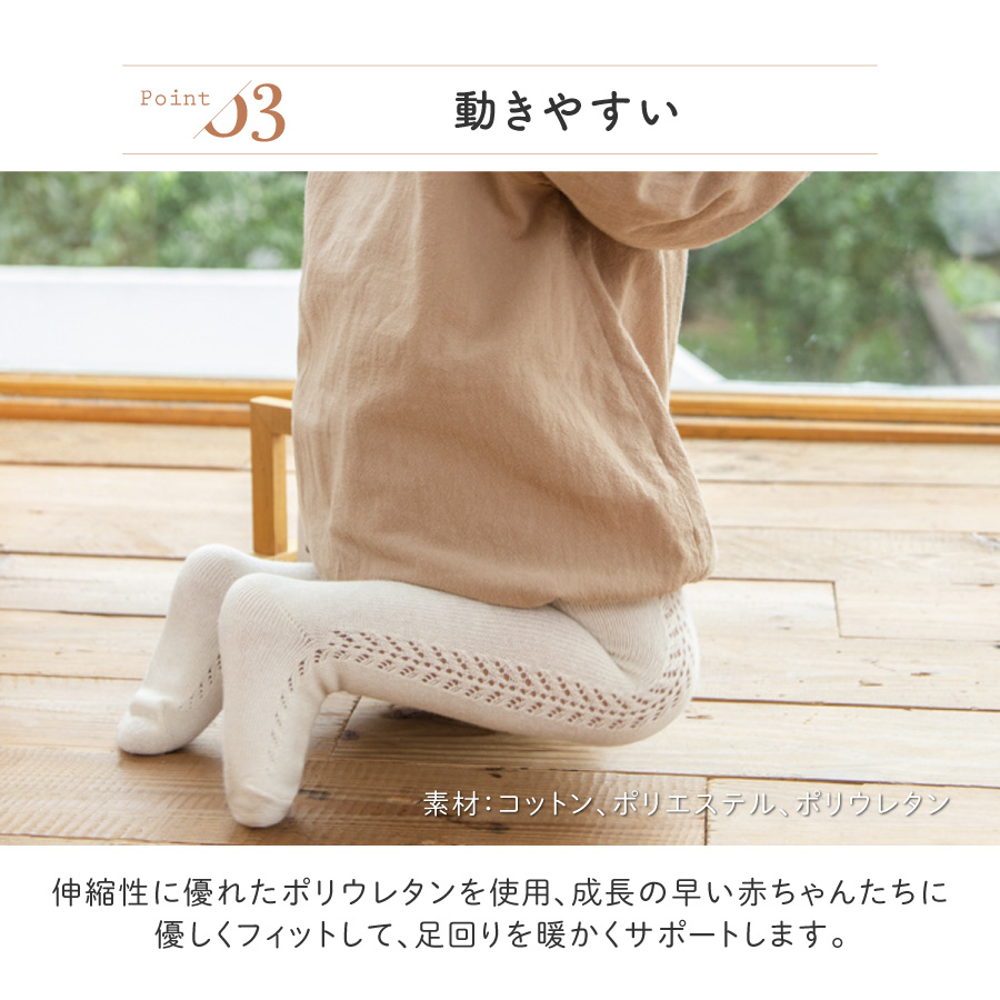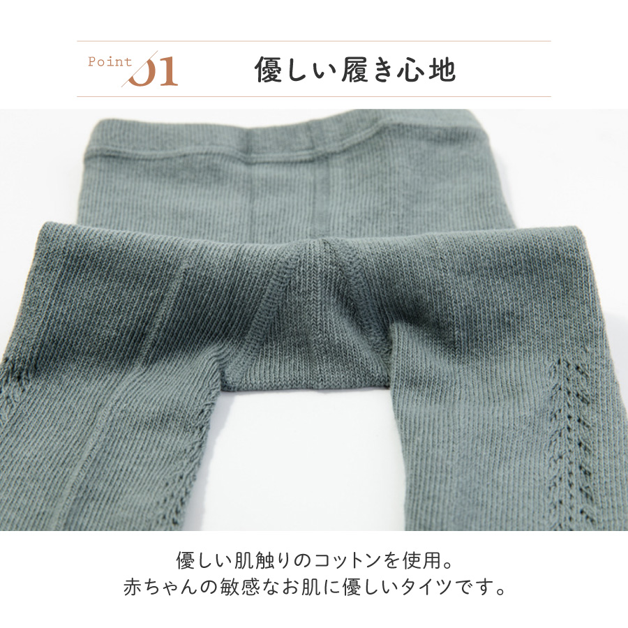 優しい肌触りのコットンを使用。 赤ちゃんの敏感なお肌に優しいタイツです。