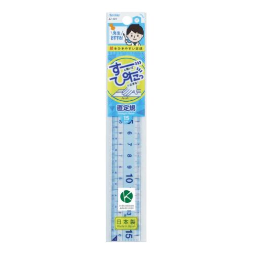 レイメイ ものさし 先生おすすめ直定規 15cm 【メール便可】学校の先生と共同開発した「先生おすすめ定規」です。<br>すーっっと自然にすべって指で軽く押さえれば、ピタッと留まってズレにくい「すべり止め」付き。<br>握力が弱い子でもしっかり押さえられて、線がひきやすいです。<br>すべりどめ機能の他、1cm毎が読み取りやすいブロックメモリ付き。<br>左右両メモリどちらからでも読み取れる左右両メモリで、左キキの人にも使いやすいです。<br>柔軟性柔軟で割れにくく、教科書、ノートにそわせやすい適度な厚み。<br>「はし0(ゼロ)メモリ」は対象物に合わせやすく、高さ、深さを測りやすいです。<br>「はし空きメモリ」は鉛筆をあてやすく線が引きやすいです。<br>学校の先生と共同開発した現場だからわかる学習しやすい定規です。<br><br>サイズ:約25x160mm<br>メーカー品番:APJ93