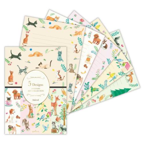 「ステーショナリーその他」 便箋 Azusa Omura レターパッド HAC5Dアニマル 手紙 便せん 5柄楽しめる! 贅沢な動物柄レターパッド キュートな動物や鮮やかな花のイラストを得意とする、米国ホールマーク社所属の日本人デザイナー[Azusa Omura]のレターパッドが登場選りすぐりのデザインで展開されるコレクション。キュートな花や動物のアートが5柄ずつ楽しめる「5デザインズ」シリーズが登場しました。猫、犬、うさぎ、鳥、森の動物をテーマにした5柄。動物たちのさまざまな仕草や表情がポイントです。犬柄には世界的に話題のあの犬種「コーイケルホンディエ」が描かれています!箔加工の表紙で、使う度に楽しい気持ちに。横罫入り。サイズ:約148x210mm(5柄10枚) メッセージ/かわいい/文房具/プレゼント/ギフト