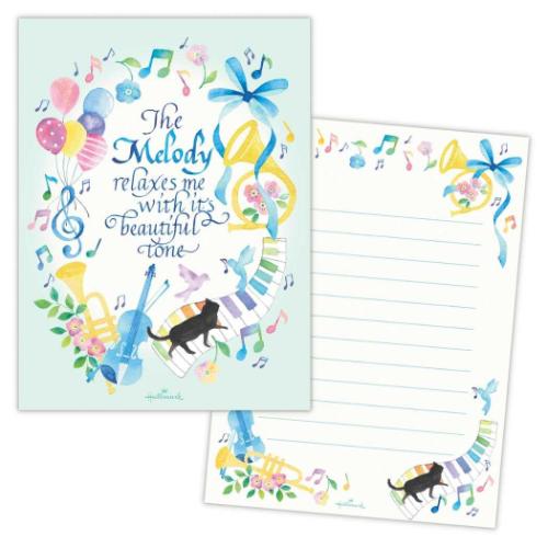 「ステーショナリーその他」 便箋 レターパッド リラックスメロディ 日本ホールマーク 手紙 手書きのお手紙で気持ちを届けよう 美しい色彩で描かれた音楽の世界水彩作家 なかにしいずみによる繊細な水彩画とハンドレタリングが見どころのデザイン。美しく心地よいメロディーが聞こえてきそうな世界観を、爽やかな色合いで描きました。ツヤ感のあるUV加工が施されています。横罫入りレターパッドです。サイズ:約131x176mm(1柄10枚) メッセージ/ギフト/かわいい/おしゃれ/文房具