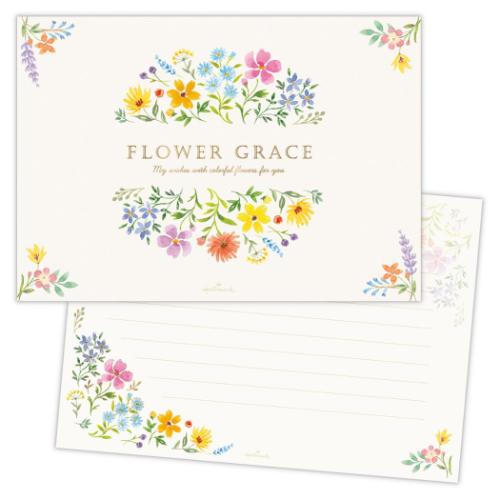 「ステーショナリーその他」 便箋 レターパッド フラワーグレイス 日本ホールマーク 手書きのお手紙で気持ちを届けよう 定番人気の花柄レターを、横位置のレイアウトで新鮮な印象に。金箔加工を施したタイトルと、その周りに咲くように描かれた色とりどりのお花が目を引くエレガントなデザインです。横罫入りです。サイズ:約210x148mm(1柄10枚入り) かわいい/おしゃれ/文房具/メッセージ/ギフト