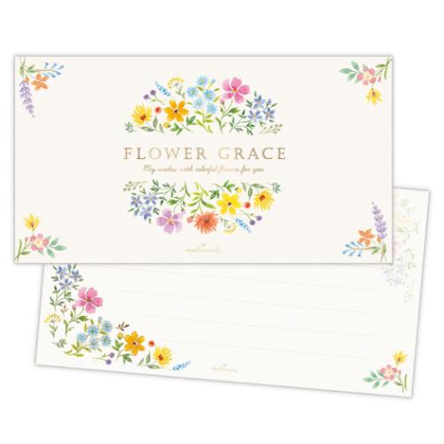 「ステーショナリーその他」 便箋 一筆箋 フラワーグレイス 日本ホールマーク 便せん 金箔x花の華やかな一筆箋 定番人気の花柄レターを、横位置のレイアウトで新鮮な印象に。金箔加工を施したタイトルと、その周りに咲くように描かれた色とりどりのお花が目を引くエレガントなデザインです。ツヤ感のあるUV加工が施されています。横罫入り。サイズ:約157x86mm(1柄14枚) メッセージ/文房具/かわいい/手紙/ギフト