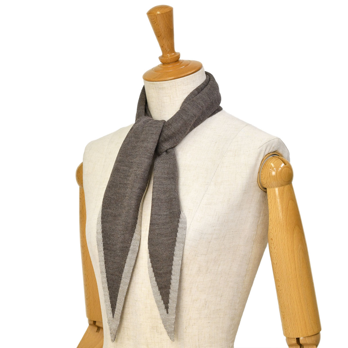 一般的な正方形のスカーフとは異なり、ひし形にデザインされたことで結び目がスッキリとまとまり易く、さらに、ニット特有の柔らかく滑らかな素材感ですので、洋服にも馴染み自然な着用感でご利用いただけます。