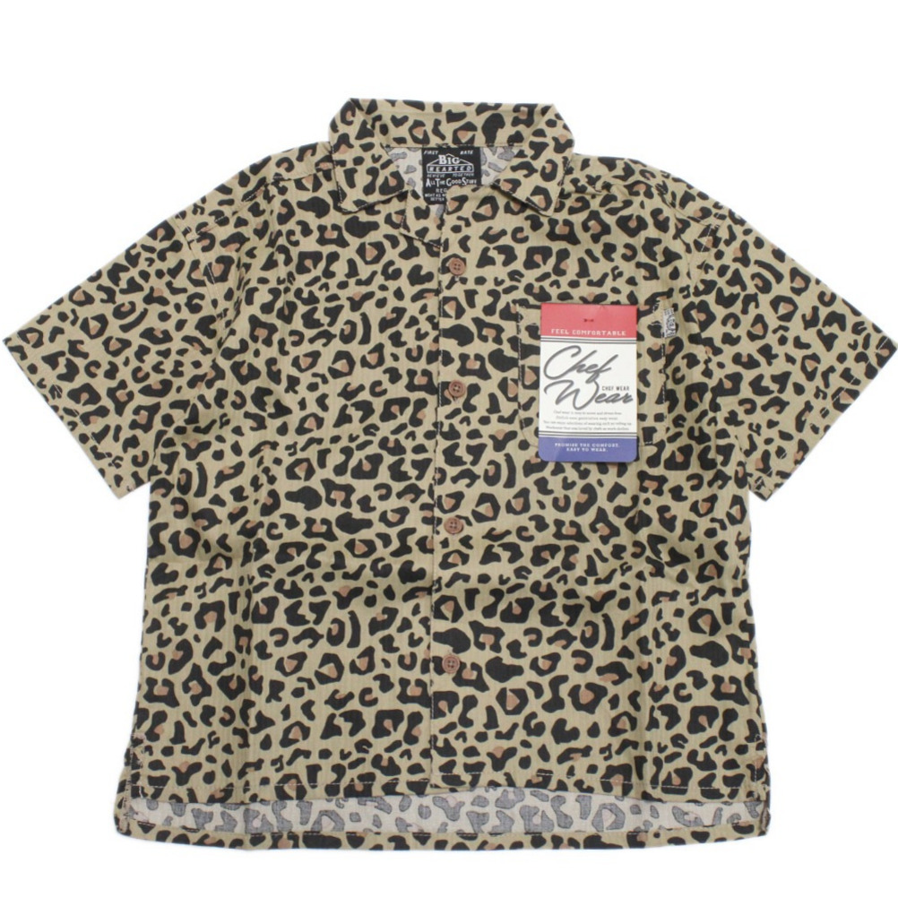 カラフルな総柄が目をひくオープンカラーの半袖シャツ。