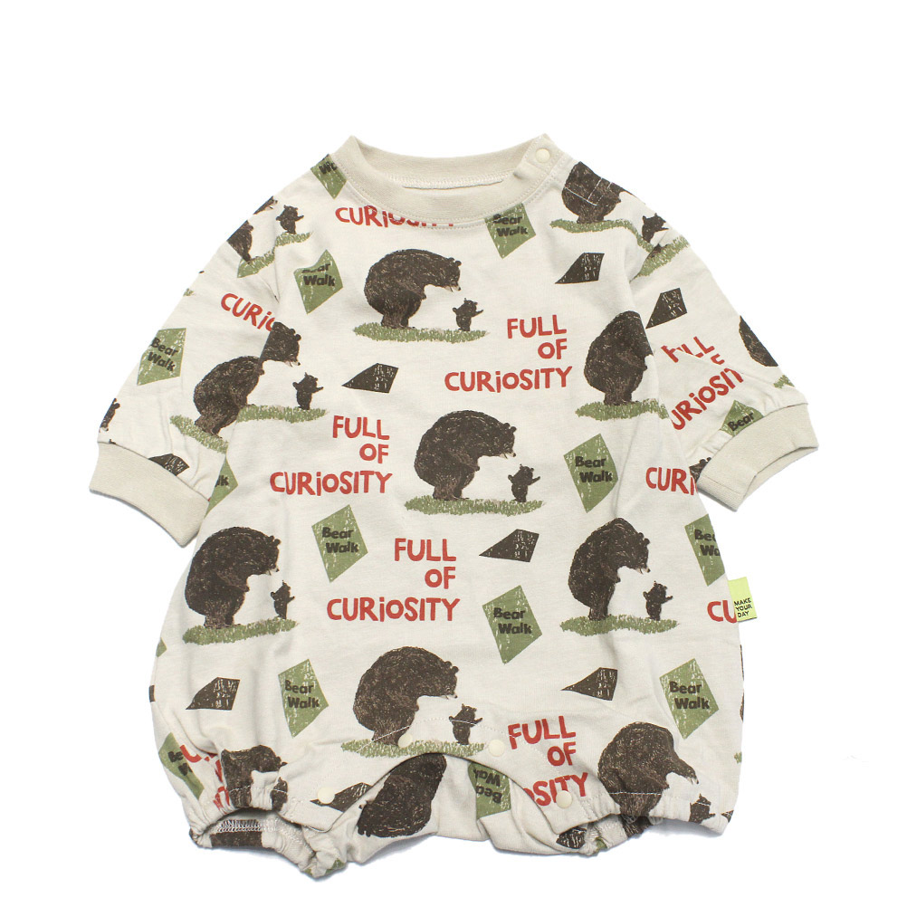 絵本のような柔らかいタッチで描かれたクマの親子イラストの総柄ロンパースです。