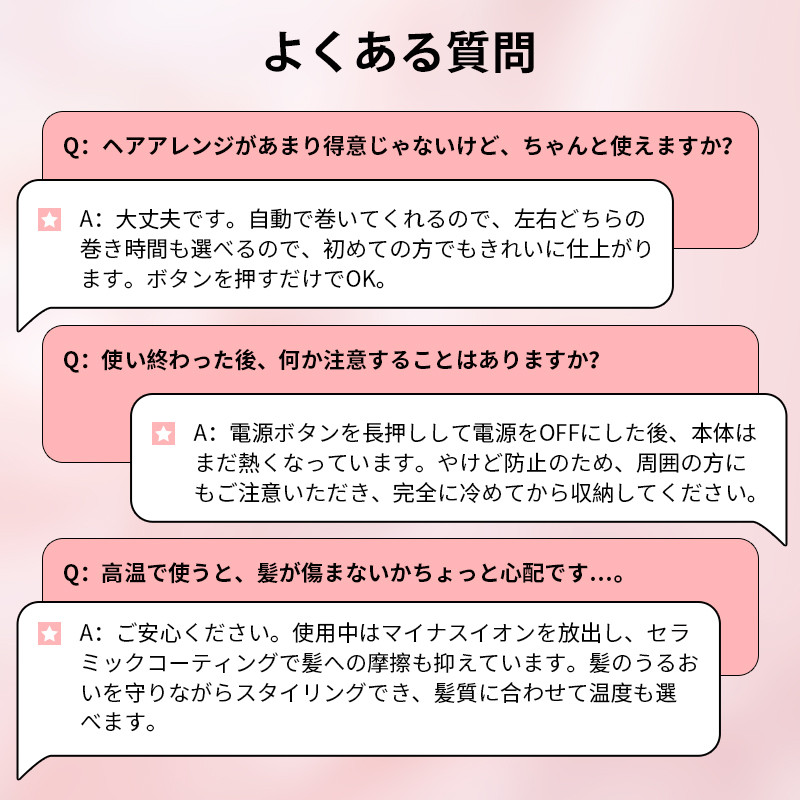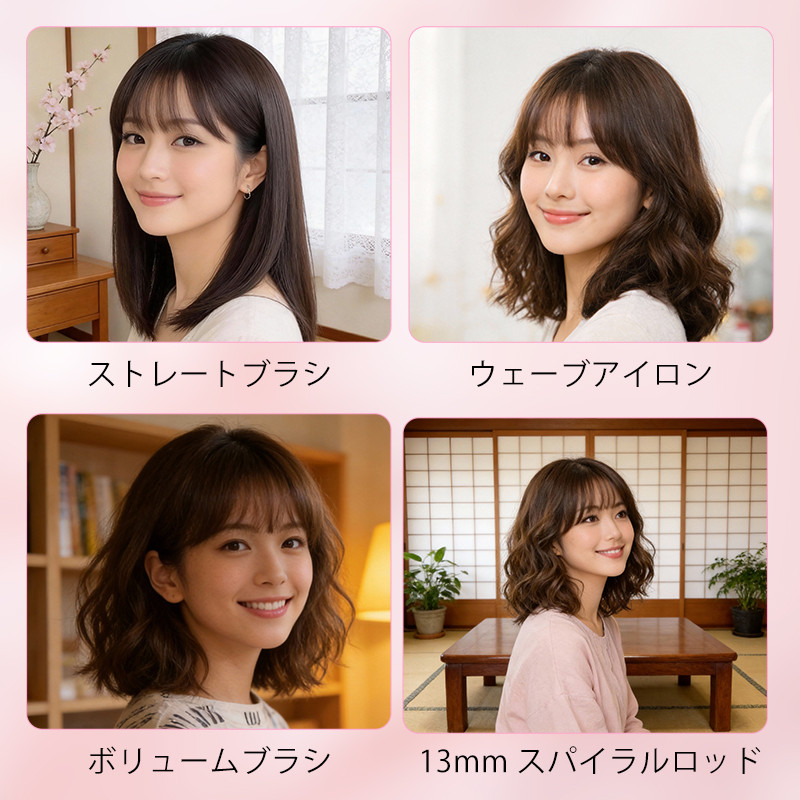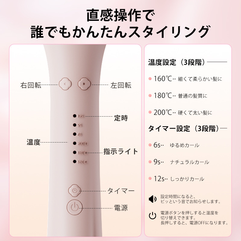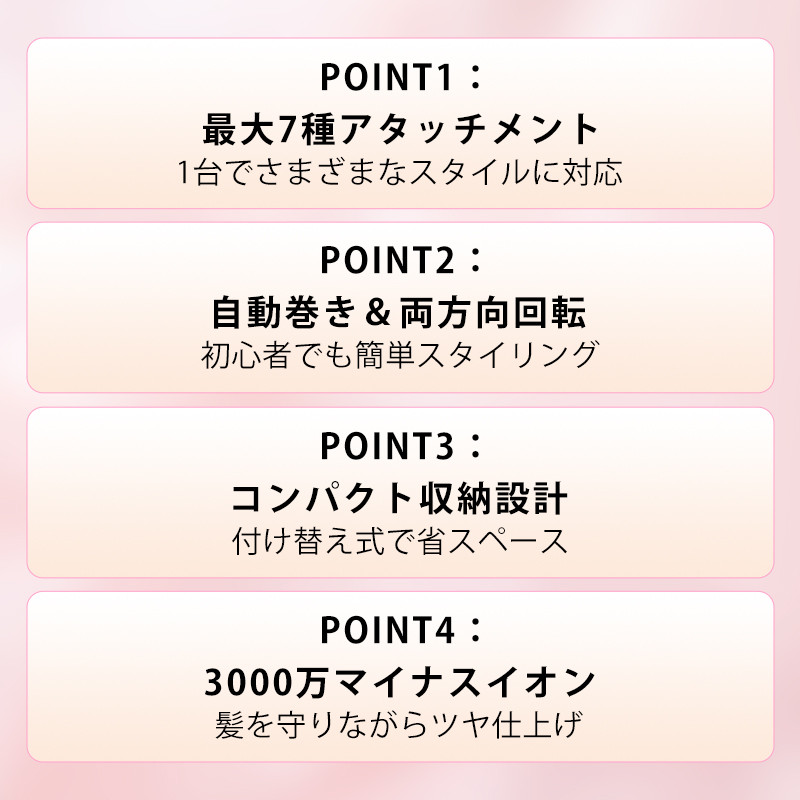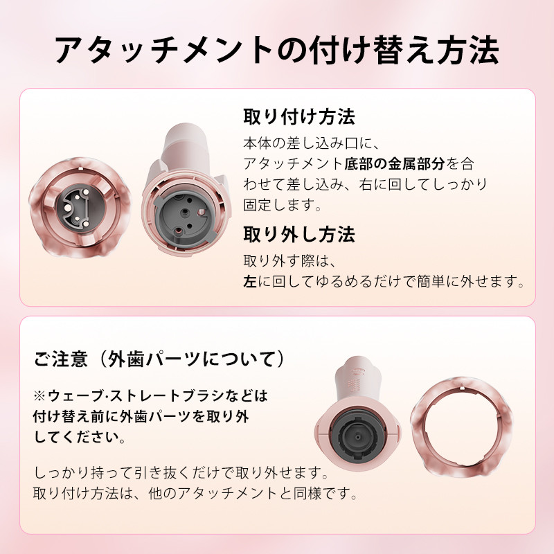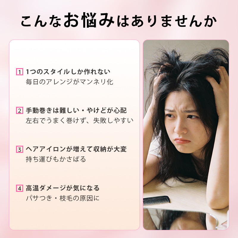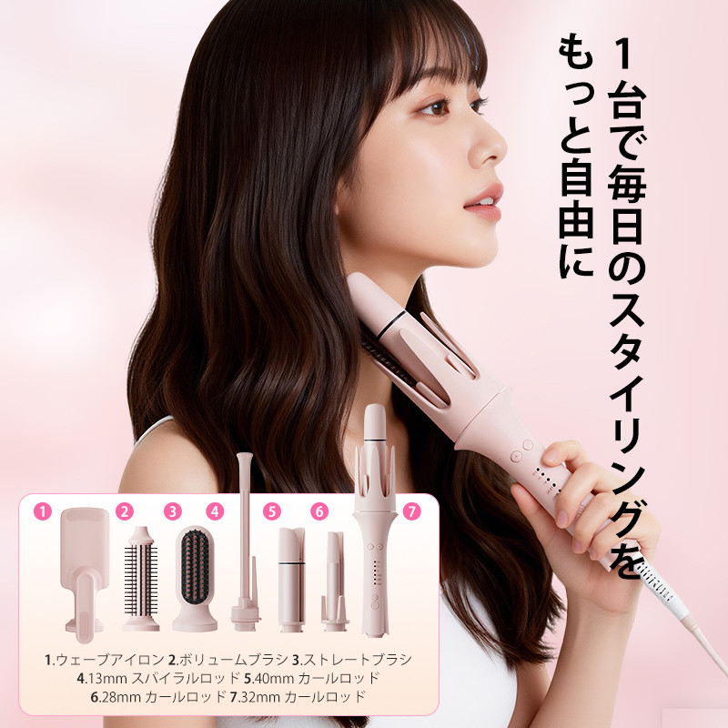 付け替え式アタッチメントと自動巻き機能で、スタイリングが苦手な方でも簡単に理想のヘアスタイルが完成します。