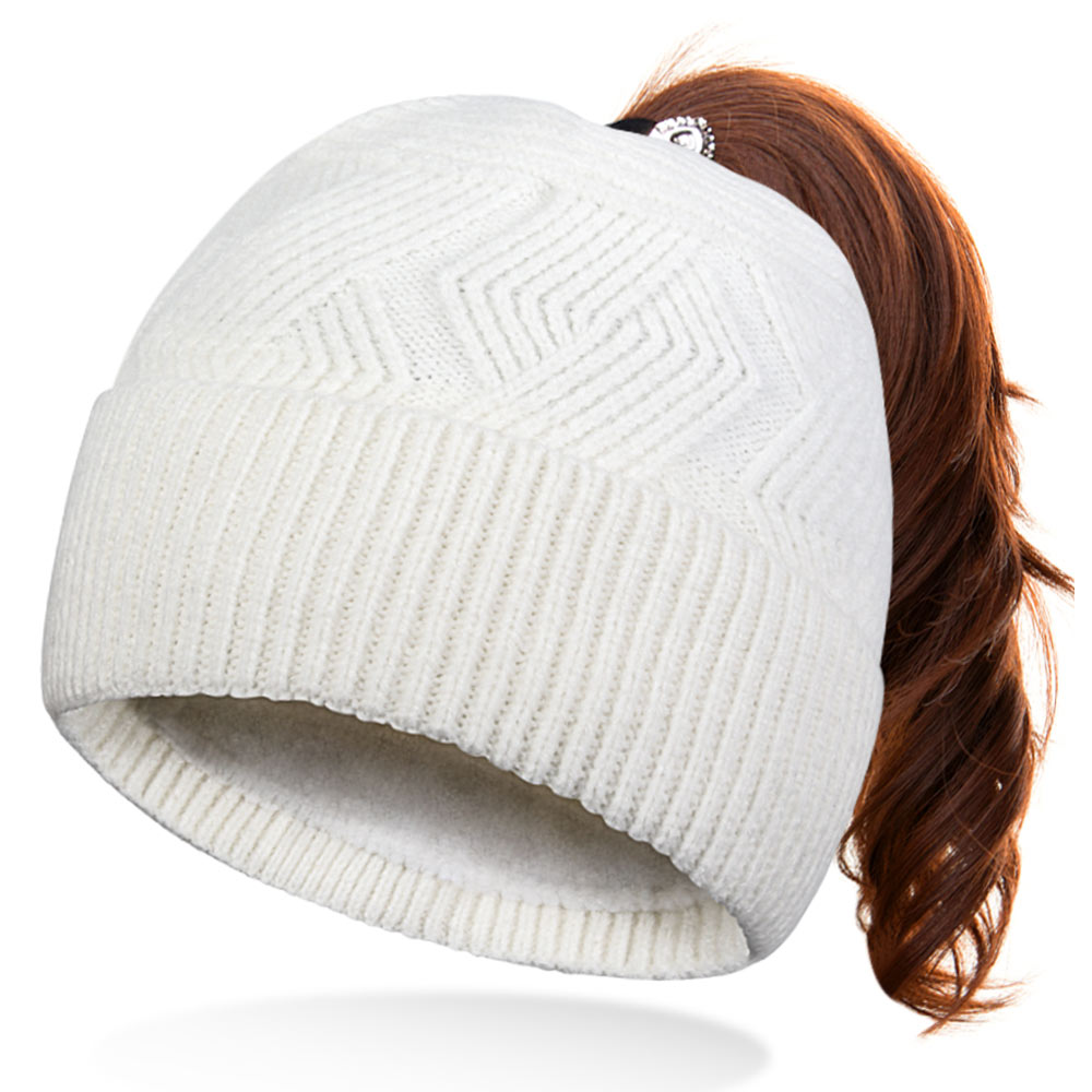 OZERO(オゼロ) ニット帽 レディース 厚手 ポニーテール穴付き 帽子 防寒 冬 毛糸の帽子 おしゃれ かわいい 無地 スキー キャップ ホワイト フリーサイズ