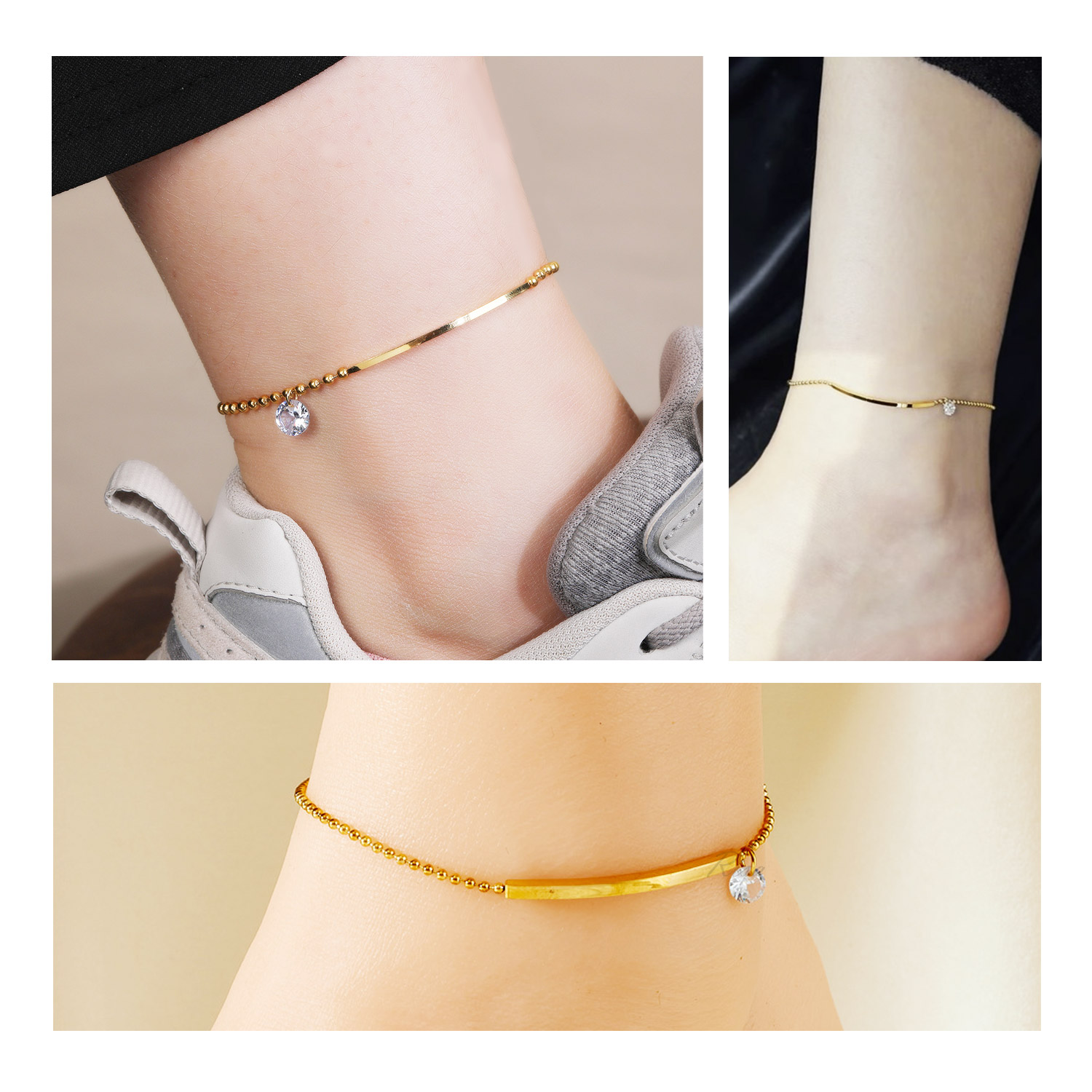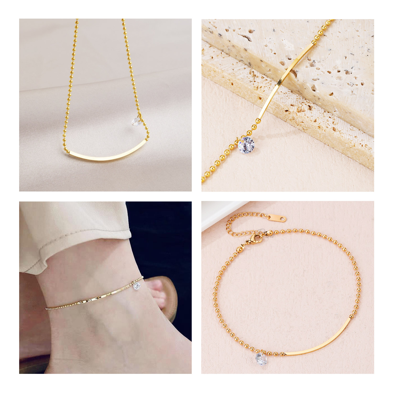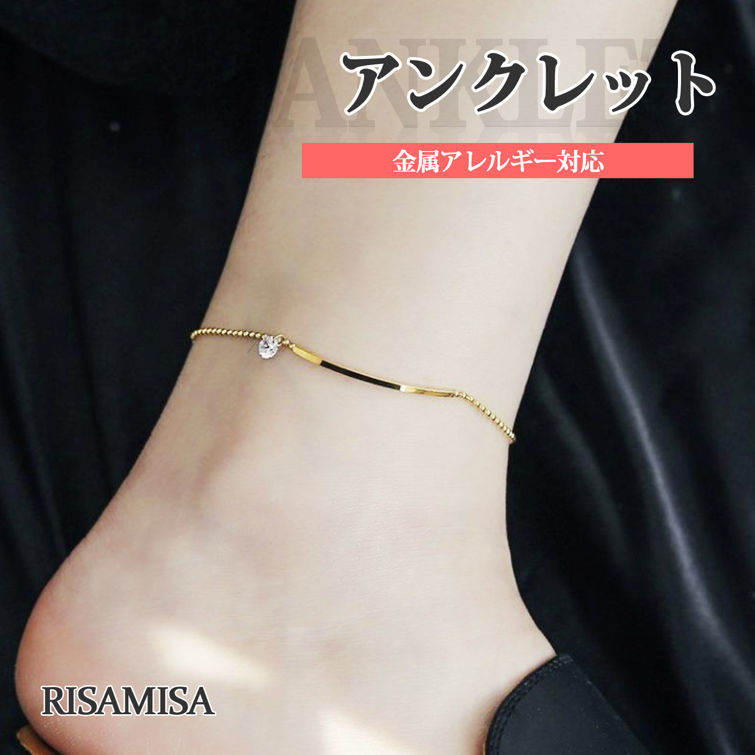 アンクレット チェーン 金属アレルギー対応 ボールチェーン ジュエル バー サージカルステンレス レディース 華奢 大人 上品 ゴールド