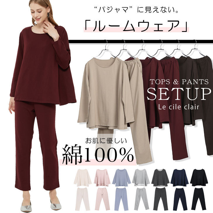 綿100 セットアップ 長袖 フレアトップス & ロングパンツ コットン レディース ルームウェア 上下 春 171-11002