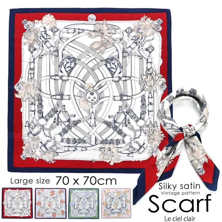 スカーフ 大判 サテンスカーフ シルクタッチ 正方形 70cm ヴィンテージ柄 夏用 大きめ プリント 柄 シルキーサテン 夏 春夏 可愛い 一年中使える 202-39039