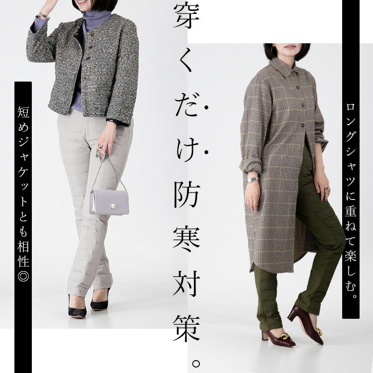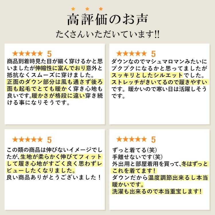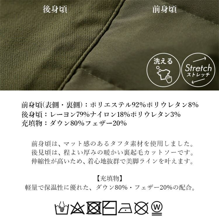 | 素材 | 【前身頃】 表側:ポリエステル92% ポリウレタン8% 裏側:ポリエステル92% ポリウレタン8% 【後身頃】 レーヨン79% ナイロン18% ポリウレタン3% レーヨン74% ナイロン22% ポリウレタン4% ※生産ロットによってどちらかになります(指定不可) 【充填物】 ダウン80% フェザー20% |