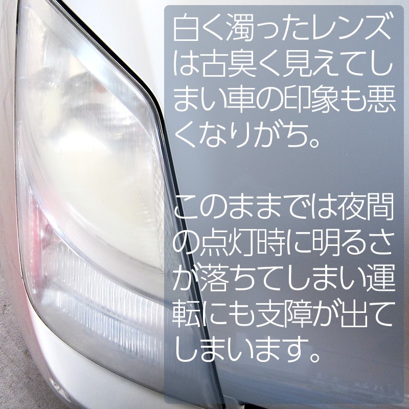 ヘッドライト、テールランプ、ドアバイザーなどのハードコートの劣化による、黄ばみ、白濁、曇りなどを化学的に除去し、新車時の澄んだ状態に戻す溶剤です。