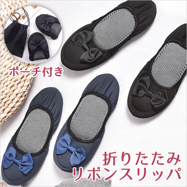 携帯用スリッパ おしゃれ 折り畳みスリッパ リボン 収納ポーチ付き 室内履き ルームシューズ