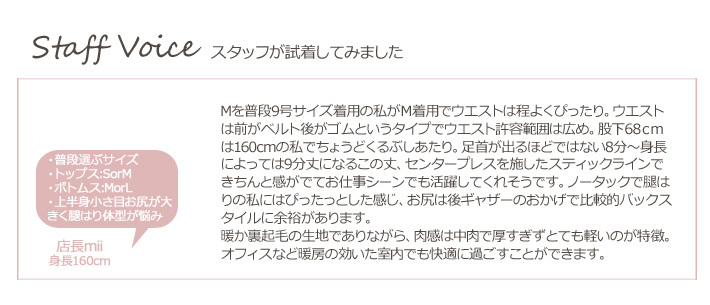 | 【S】ウエスト66(66〜ゴム伸縮) ヒップ89 股上23.5 股下67 わたり幅29 総丈90.5 裾幅16 【M】ウエスト70(70〜ゴム伸縮) ヒップ93 股上24 股下68 わたり幅29.5 総丈92 裾幅16.5 【L】ウエスト74(74〜ゴム伸縮) ヒップ97 股上24.5 股下68 わたり幅30 総丈92.5 裾幅17 【LL】ウエスト78(78〜ゴム伸縮) ヒップ101 股上25 股下68 わたり幅30.5 総丈93 裾幅17.5 ※採寸方法は当店 サイズガイド を参照して下さい。 |