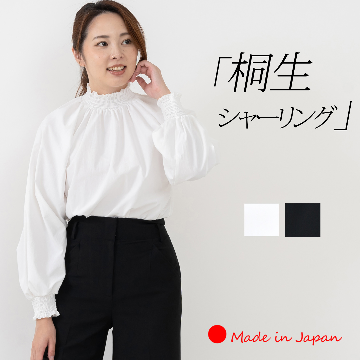 ■特徴 桐生産地ならではの上質なシャーリング技術を使った、日本製プルオーバーブラウス。繊細なシャーリングとギャザーが、体のラインを拾いすぎず上品な立体感を演出します。きれいめなオーバーブラウス仕様で、一枚でもスーツのインナーとしても着回し自在。白の清潔感が装いを明るくまとめ、入学式・卒業式、顔合わせなど母のセレモニースタイルにふさわしい一枚です。