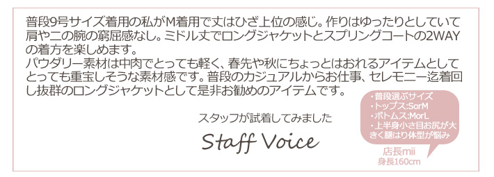 | 【S】バスト98 着丈89 肩幅38 袖口幅27 袖丈58 【M】バスト102 着丈90 肩幅39 袖口幅28 袖丈59 【L】バスト106 着丈91 肩幅40 袖口幅29 袖丈60 ※採寸方法は当店 サイズガイド を参照して下さい。 |