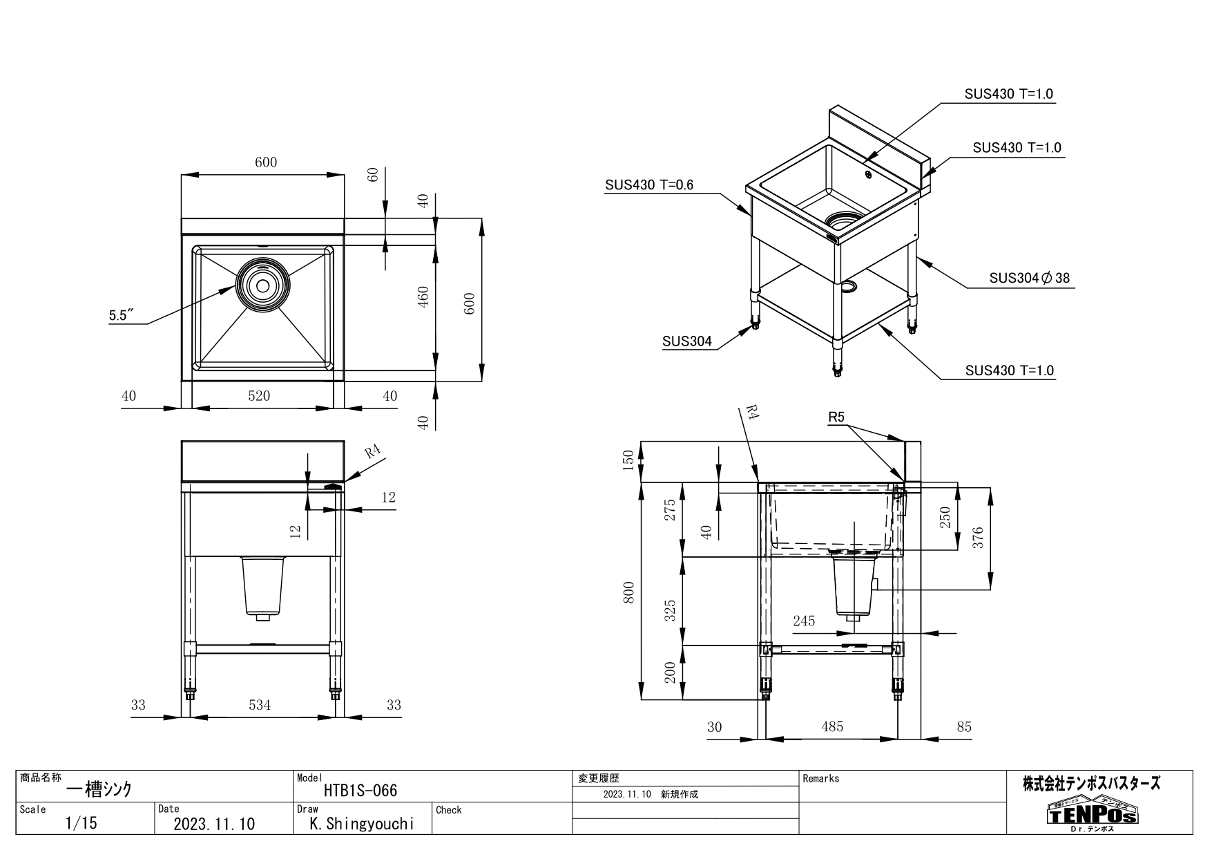 材質:シンクボウル・スノコ・化粧板SUS430、脚・アジャストSUS304