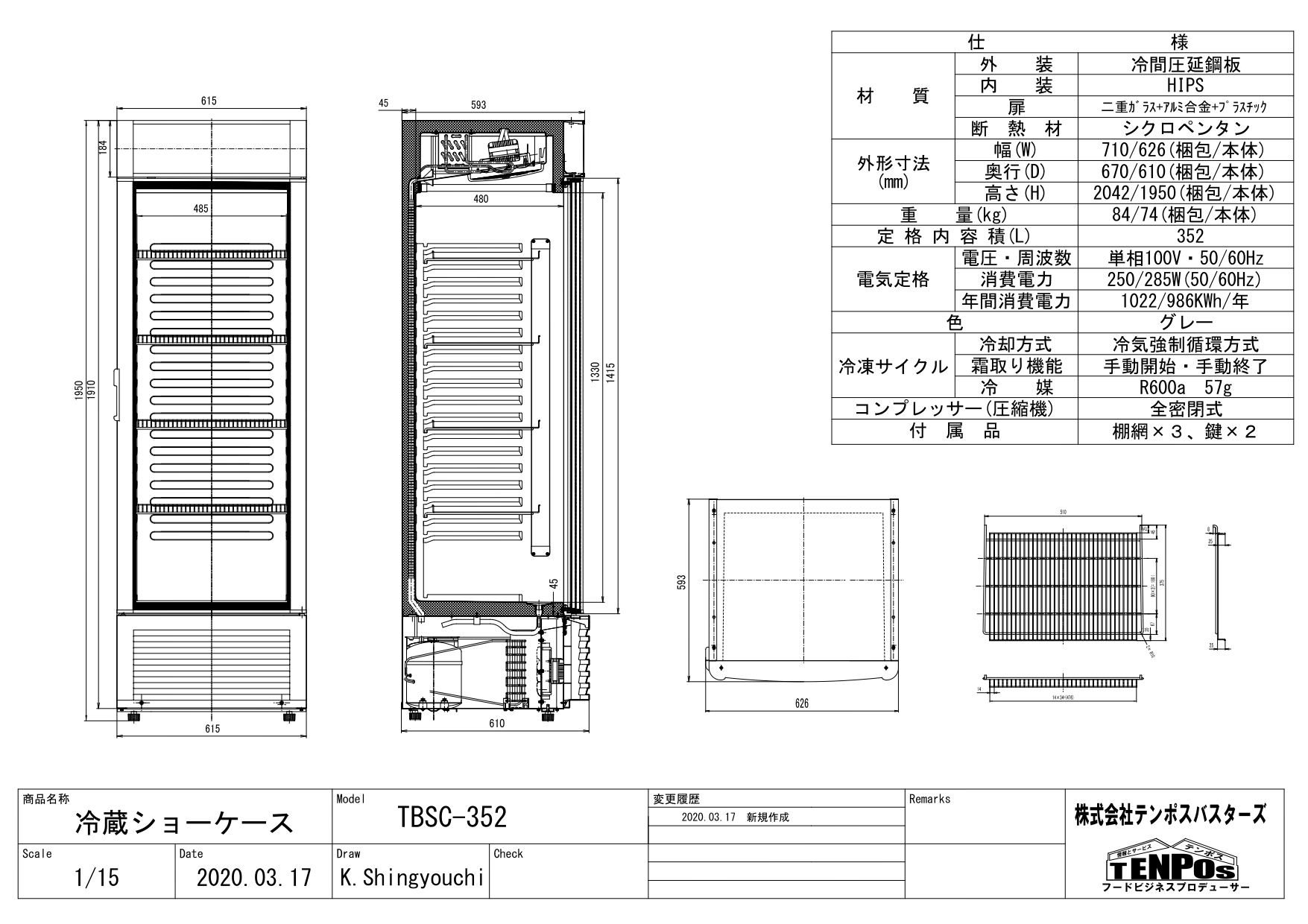TBSC-352【テンポスオリジナル】冷蔵ショーケース 幅626×奥行610×高さ1950(mm) 単相100V/【業務用/新品】【送料別途】