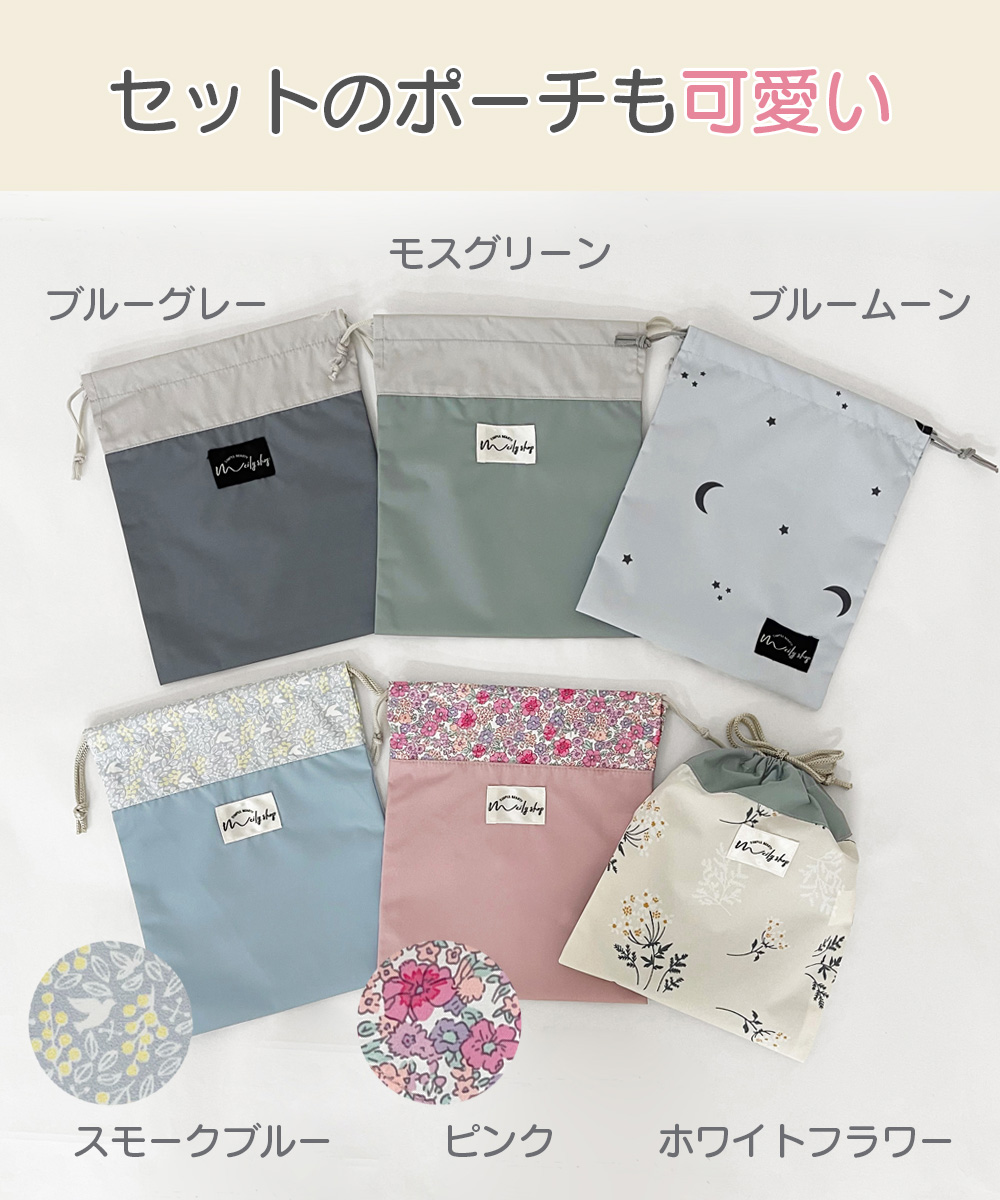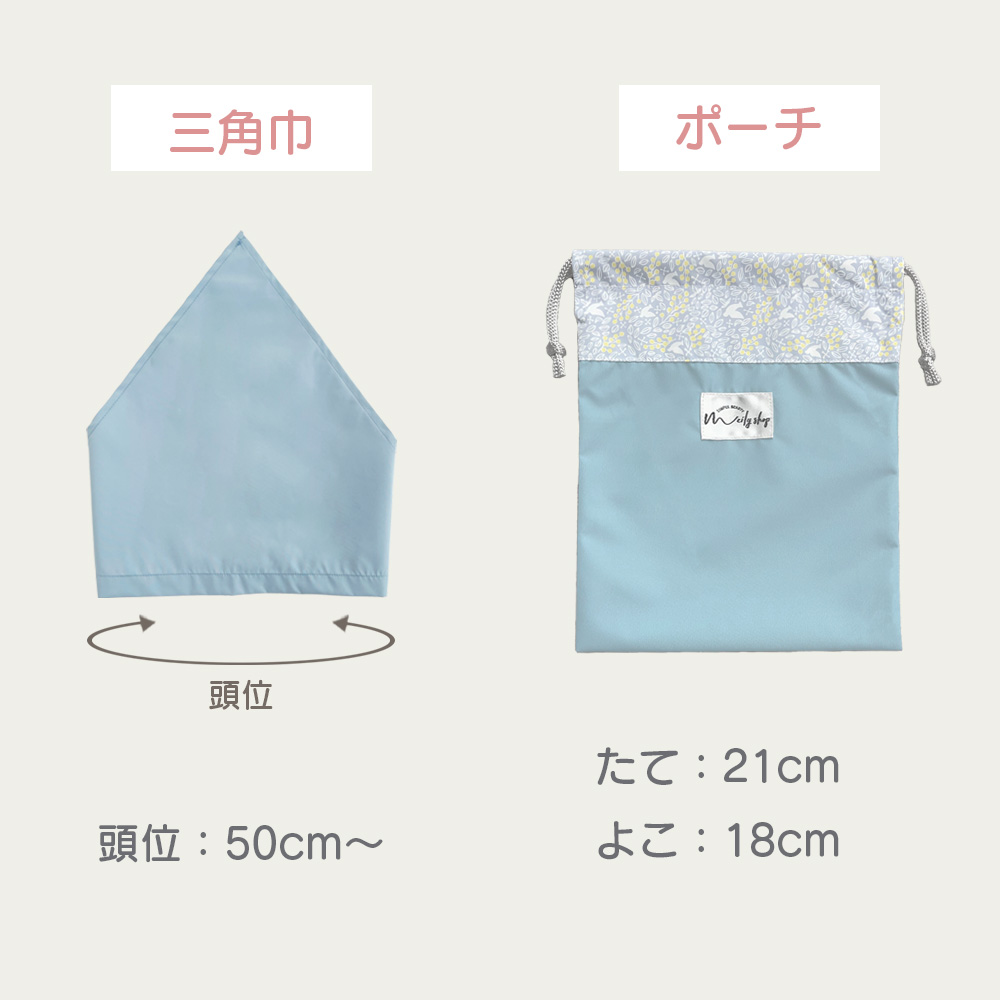 収納できる袋がついたエプロンと三角巾のセットです。シンプルなデザインなので低学年から高学年まで長く使えます。