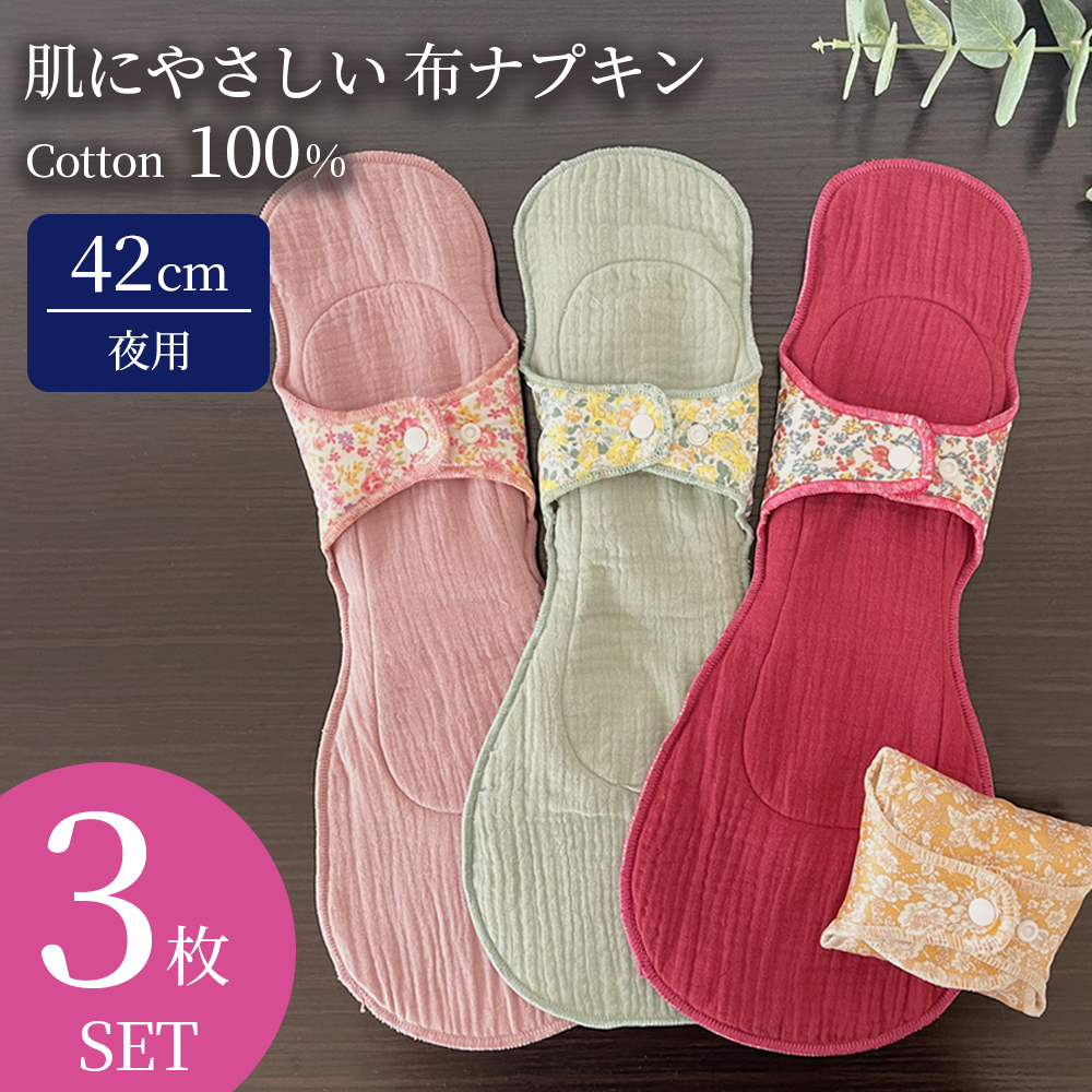 布ナプキン コットン 夜用 3枚セット 生理 Lサイズ 送料無料 42cm 吸水 綿 多い日 横漏れ 後漏れ 生理用 かわいい ロング 夜 布 サイズ調整 スナップボタン