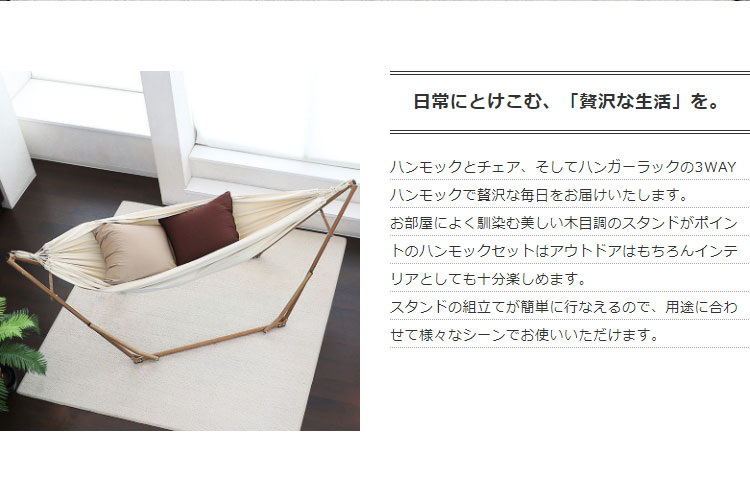 ハンモックとチェア、ハンガーラックの3WAY仕様のハンモックセットです。