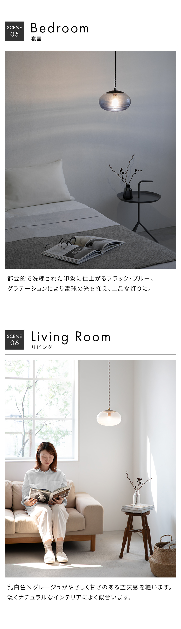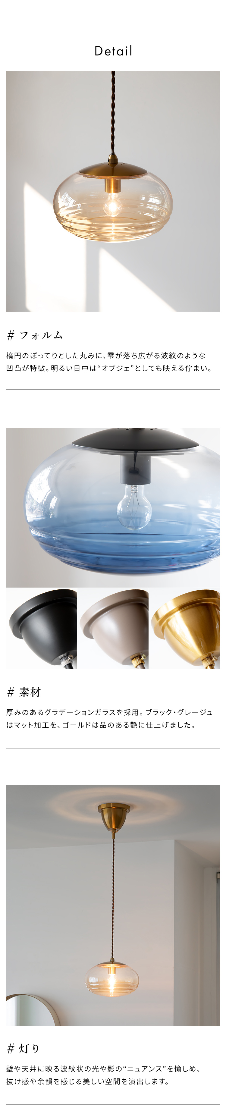 空間にさりげなくアクセントを添えて、点灯時も消灯時も空間に美しい余韻を残し、光の揺らぎや陰影を愉しむ静かな照明です。
