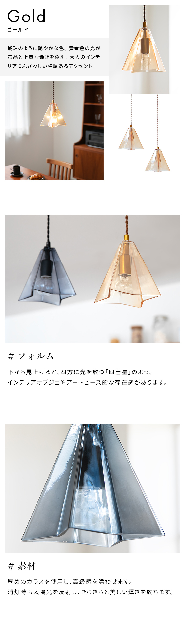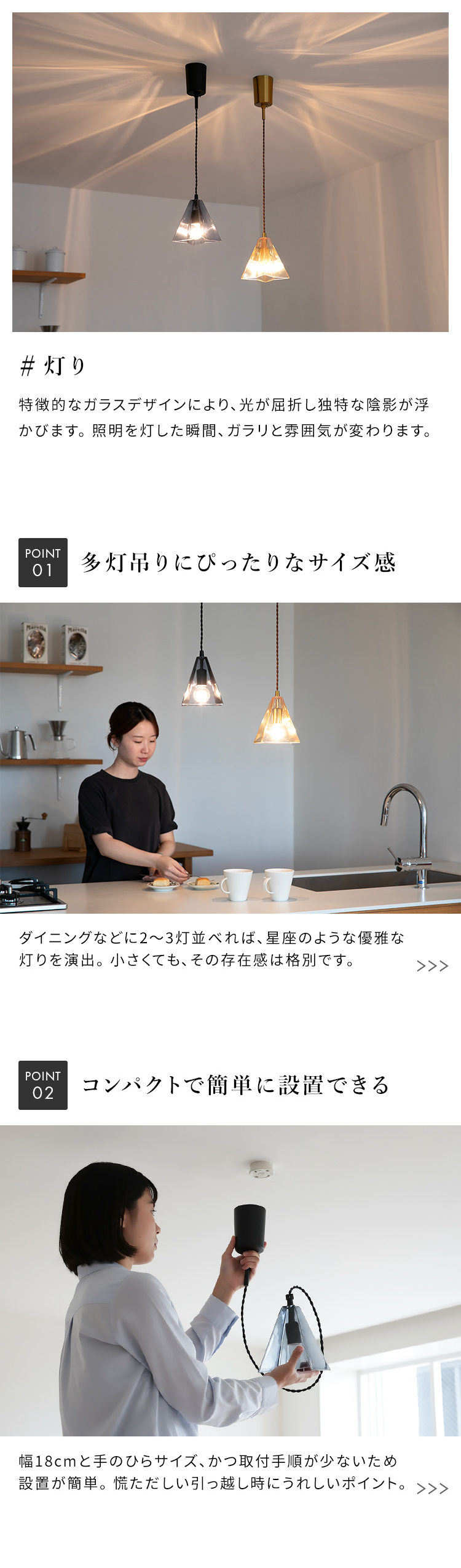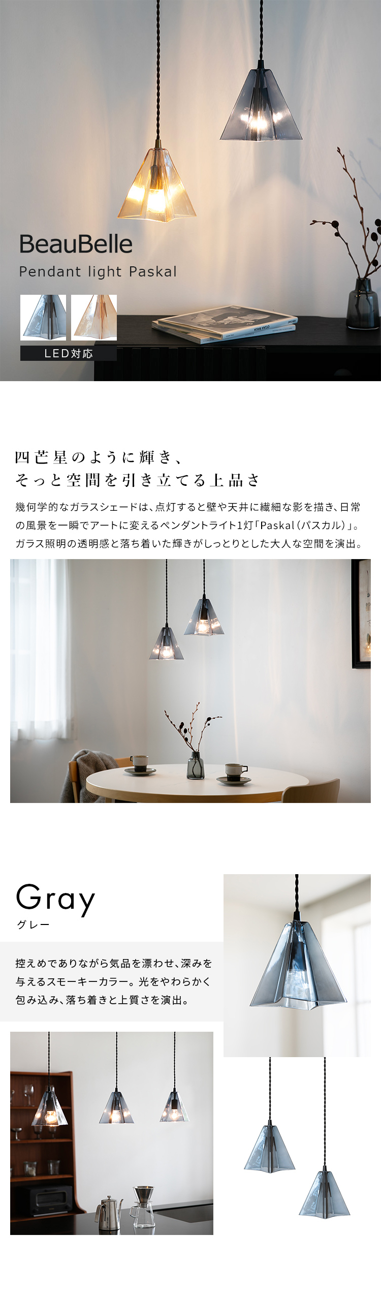幾何学的なガラスシェードは、点灯すると壁や天井に繊細な影を描き、日常の風景を一瞬でアートに変えるペンダントライト1灯「Paskal(パスカル)」。