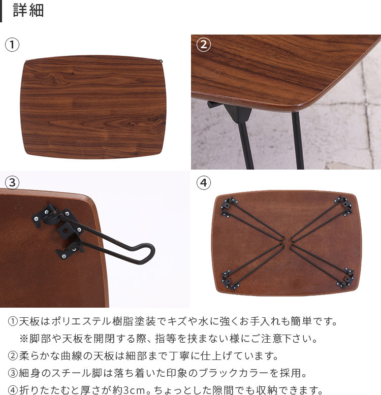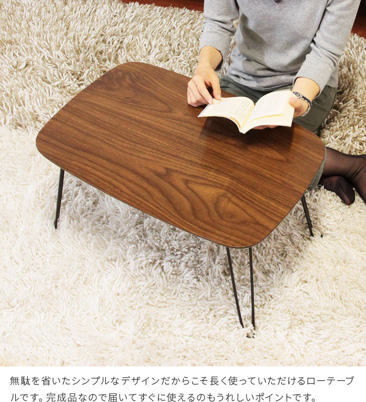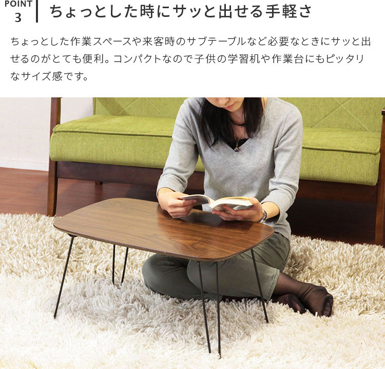 一人暮らしにちょうどいいコンパクトサイズで省スペースに収納できます。軽量で楽に運ぶことができるので、使いたいときにだけサッと出せる使い勝手のよいローテーブルです。