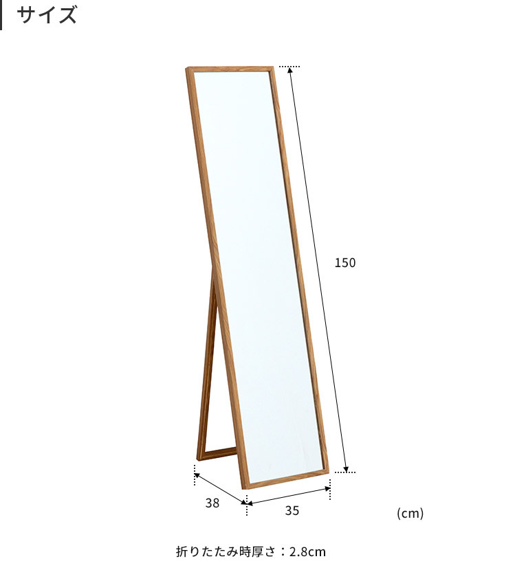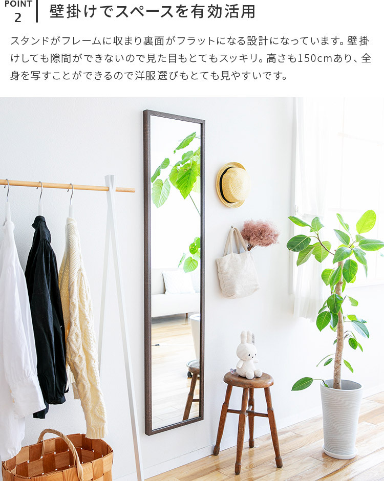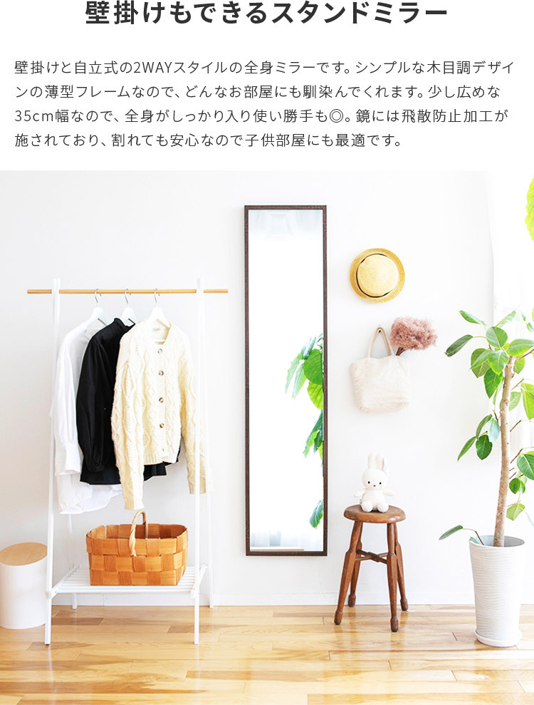 ウォールミラー スタンドミラー 2WAY 35cm×150cm スリム 全身 全身鏡 姿見 鏡 壁掛けミラー 自立式 全身ミラー 木製 折りたたみ コンパクト 薄型 おしゃれ