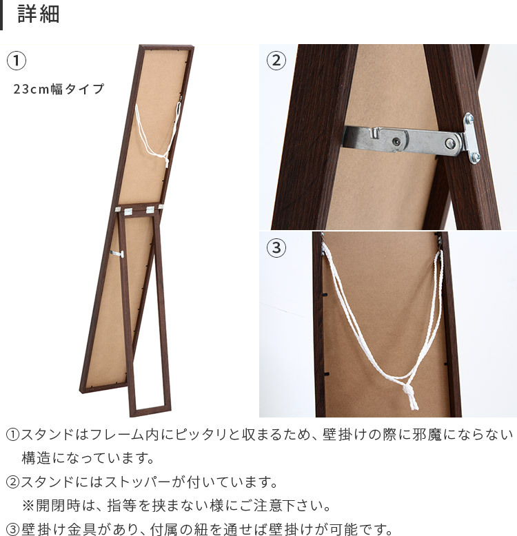 2WAY ウォール&スタンドミラー 幅23cm 高さ150cm 全身鏡 姿見 鏡 壁掛けミラー スタンドミラー ウォールミラー 自立式 全身ミラー 23cm 飛散防止 木製 折りたたみ コンパクト スリム 薄型 軽量 玄関 寝室 子供部屋 おしゃれ かわいい シンプル 北欧 ホワイト 白 ブラウン ナチュラル