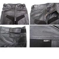 色は黒です。バンクセンサー付き。殆どの部分がパンチングレザーで風通しがよくなっています。ブーツアウトタイプの革パンツです(ズボンの裾がブーツの外になります)。ウエストは腰のアジャスターで締め込み可能です。腰のファスナーでジャケットと結合できます。本革のレザーパンツでこの価格ならお買い得ですよ 全長104cm, 股下74cm,ヒップ90cm。[サイズ30](ウエスト77-81cm) 全長104cm, 股下75cm,ヒップ95cm。[サイズ32](ウエスト80-85cm) 全長105cm, 股下77cm,ヒップ100cm。[サイズ34](ウエスト86-90cm) 全長106cm, 股下77cm,ヒップ102cm。[サイズ36](ウエスト90-95cm) 全長107cm, 股下78cm,ヒップ104cm。注意:画面上と実物では多少色具合が異なって見える場合もございます。ご了承ください。サイズの多少の誤差はご了承下さい。購入後サイズが合わなかった場合は在庫があれば交換可能です。(但し往復の送料がかかります。商品到着後5日以内にご連絡ください)