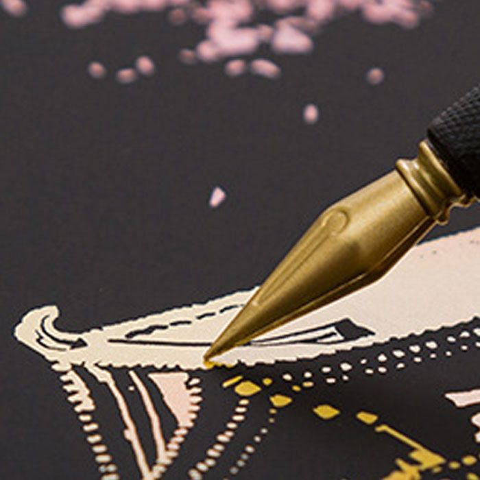 黒いスクラッチ面を専用のスクラッチペンで削ると、カラーの美しい線が浮かび上がってきます。