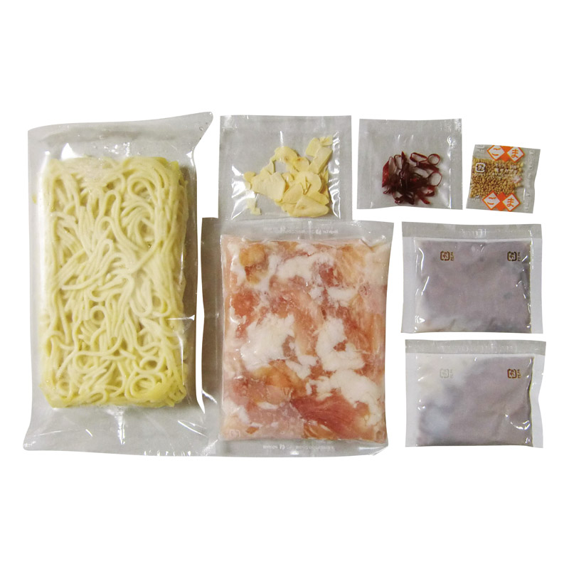 内容:牛もつ肉(国内産)(100g)・ちゃんぽん麺(180g)・にんにく(3g)・唐辛子(0.5g)・白ごま(0.7g)×各1、もつ鍋用濃縮とんこつスープ(36g)×2
